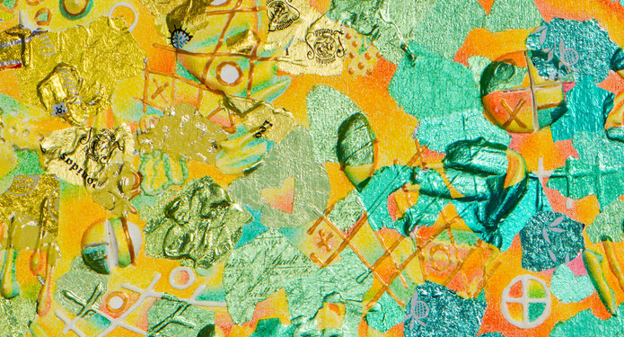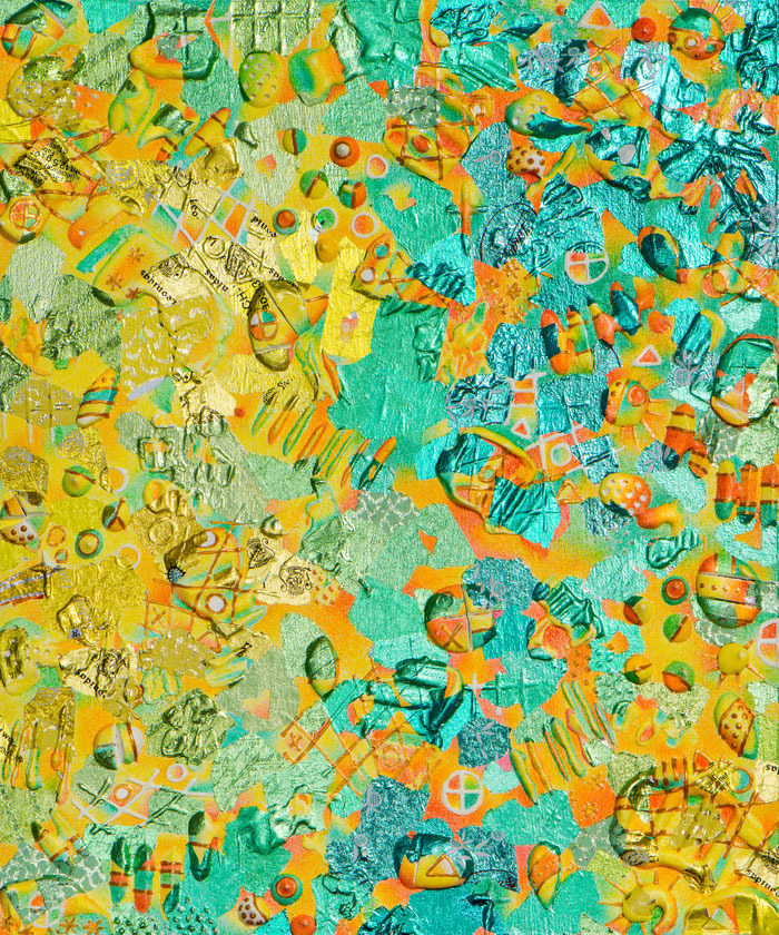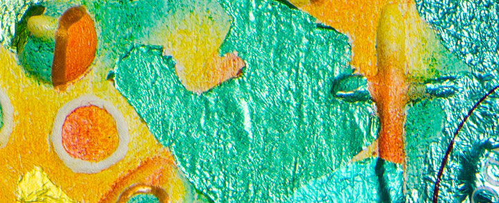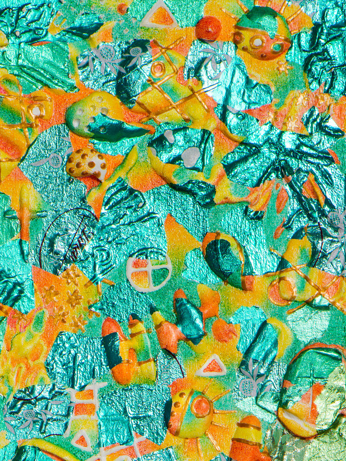 Aluminiumfolien gearbeitet, komplettiert mit Buntstiftschraffuren und einigen anderen Werkstoffen.